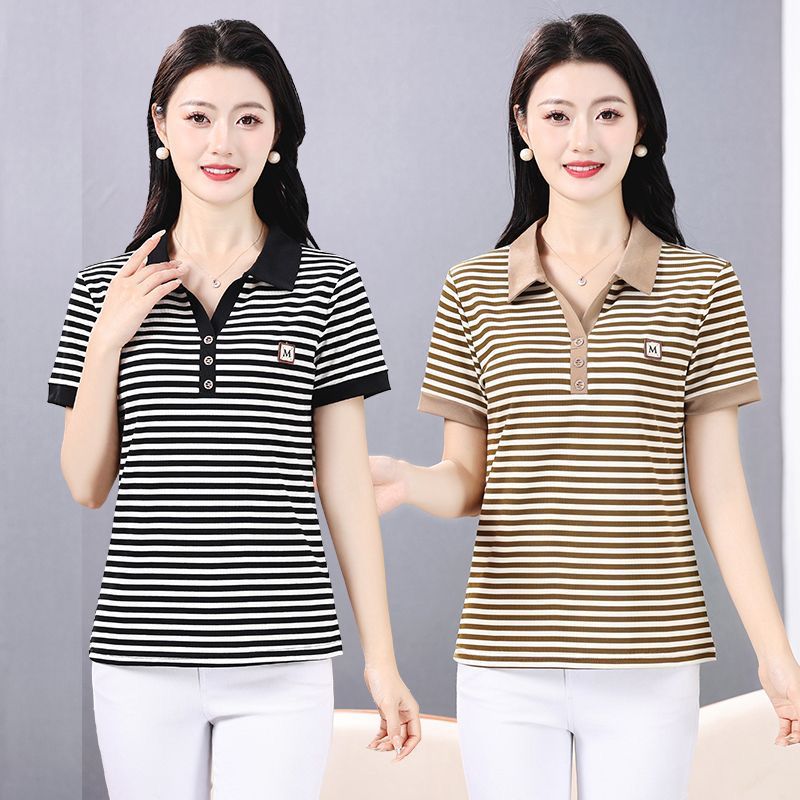 改良金は注文する前に実物の高級婦人服の夏のファッションの襟のストライプの半袖のシャツを見てください。