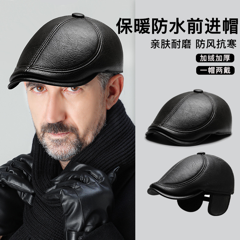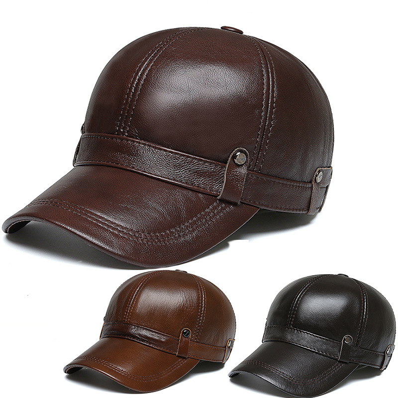 本革帽子メンズ冬防風耳保護野球帽アウトドアトップ層牛革カジュアルファッションシンプル鴨舌帽