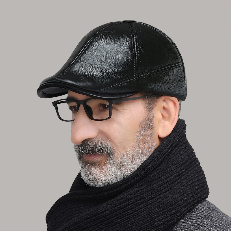 トップ層牛革前進帽男性冬真皮帽子男性帽子前進帽男性中年老人ベレー帽男性