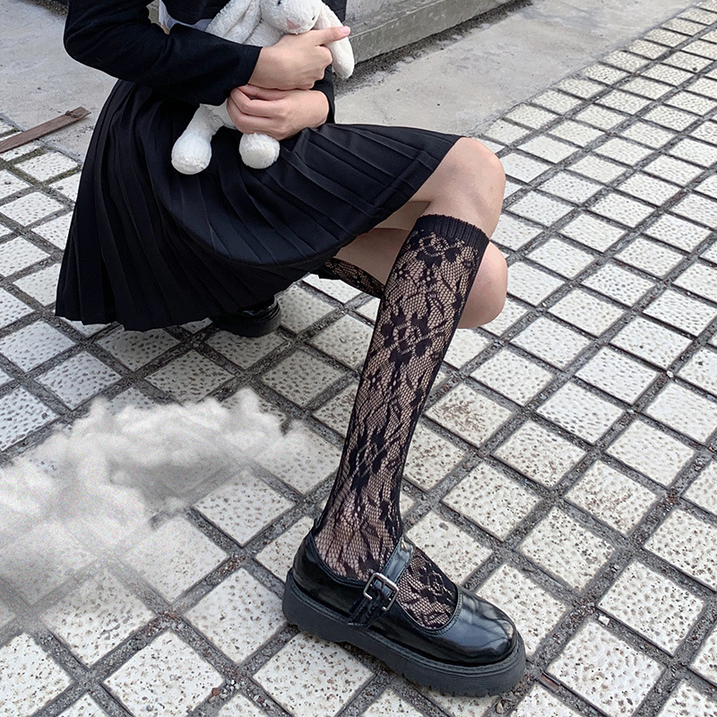 ふくらはぎの靴下jk黒ストッキングの子供の中筒の黒いレースの筒の透かし彫りの春の薄いタイプのストッキング