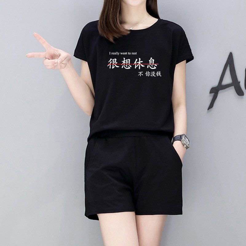 特大サイズの女性の夏ファットMM半袖ツーピーストップス学生韓国風カジュアルワイドレッグショーツスーツ100kg