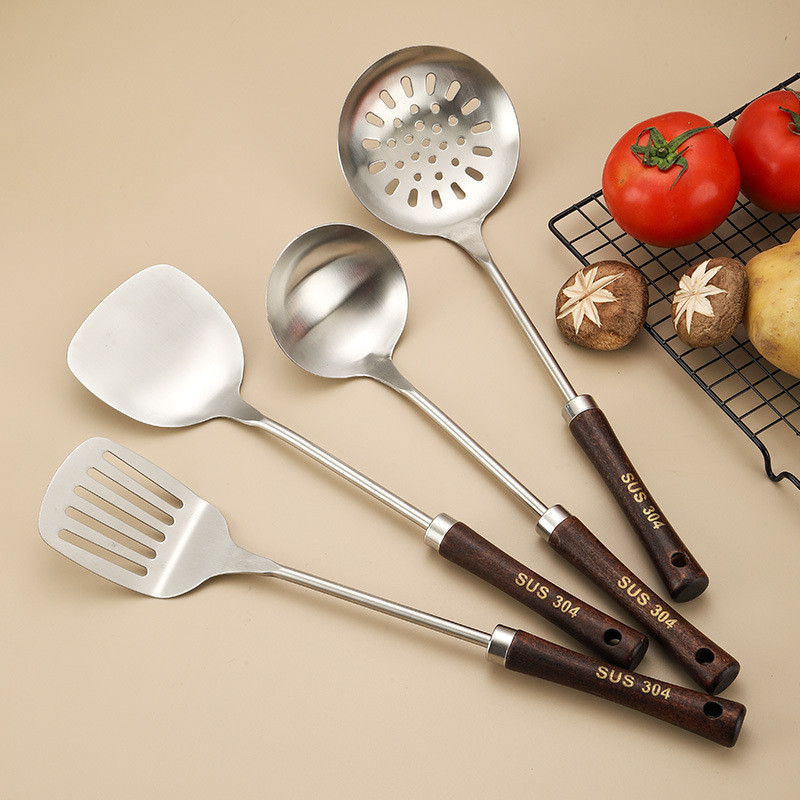 ステンレス製スパチュラ、スープスプーン、フライパンスパチュラ、ザル、キッチン用品4点セット、家庭用キッチン調理用スパチュラ、調理用スパチュラ