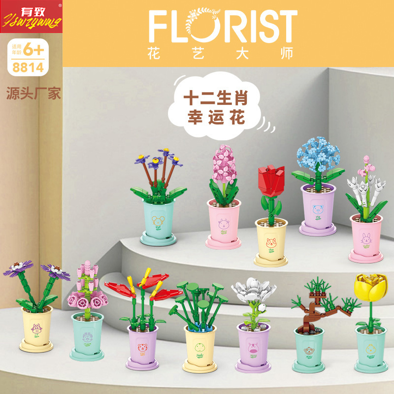 新春吉祥花梅の花冬青水仙花桃の花の積み木を飾って新年の飾りを飾って男女のプレゼントを飾って鉢植えにします。