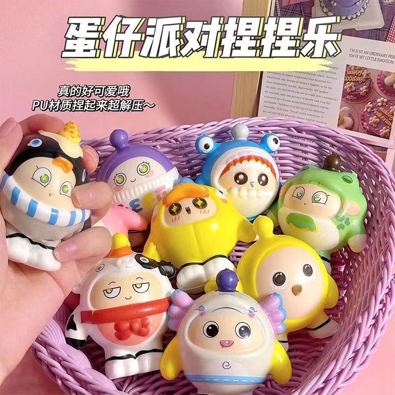 タマゴパーティーのぬいぐるみが可愛い人形をつまんでいます。幼稚園の子供の誕生日プレゼントを共有します。