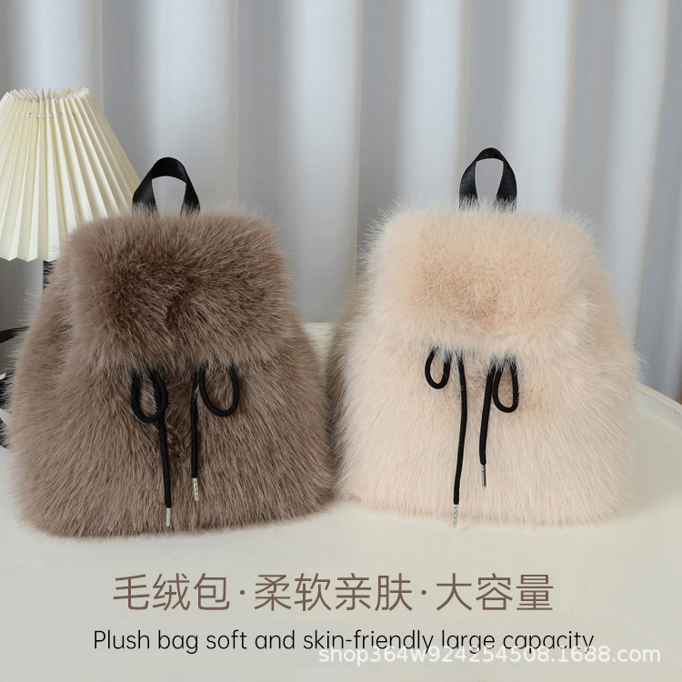 2025新型の狐の毛のリュックサックの女子大学生のカジュアルな縄のカバーの磁気ボタンの大容量のカバンの女性をまねます。