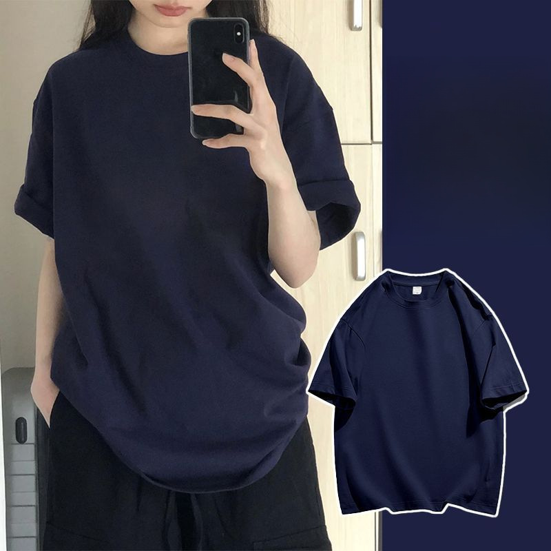 ピュアコットンラウンドネックヘビーウェイトネイビーブルーTシャツレディースインハイストリートソリッドカラーボトムシャツ半袖多用途カジュアルスタイルメンズ