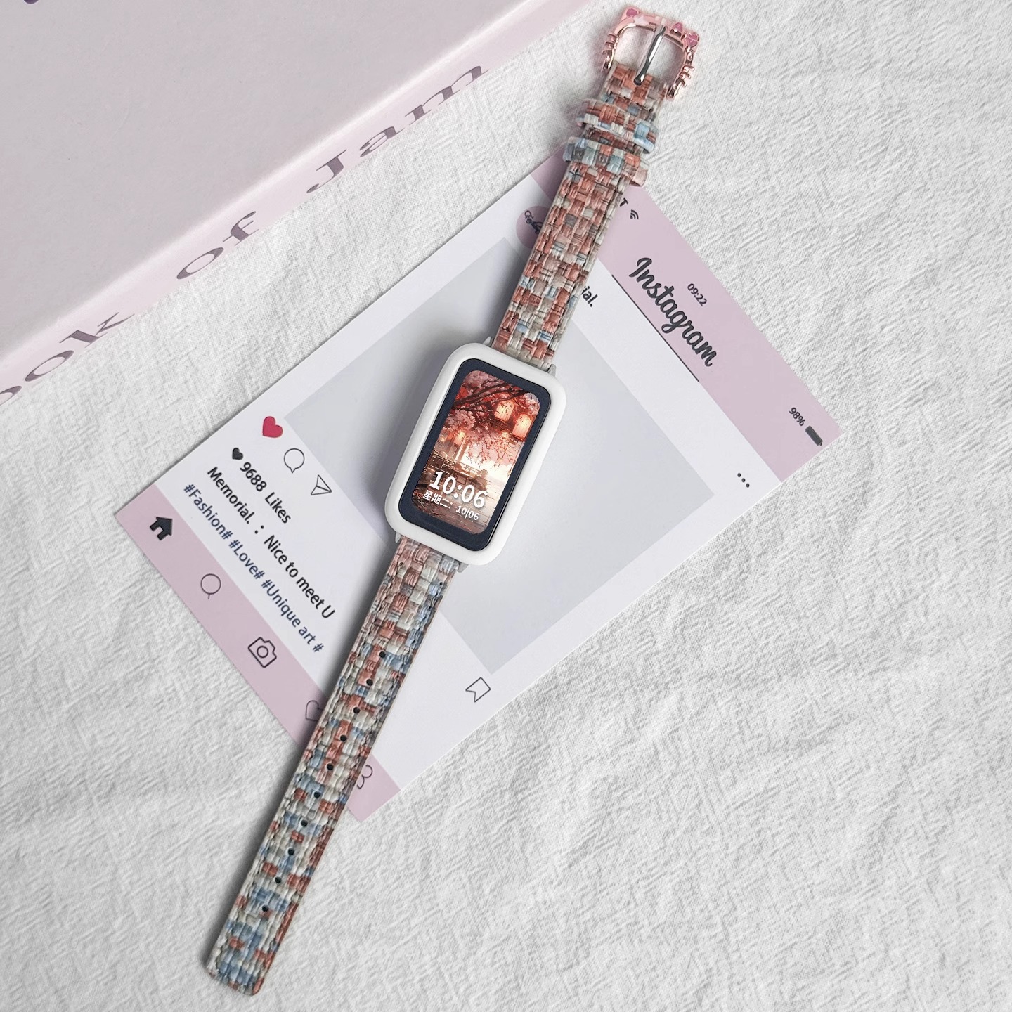 Huawei Band 10/9 ストラップ草マットパターンフラットテールベルト Honor Band 10/9 ダイヤモンドバックルリストバンド女性用に適しています