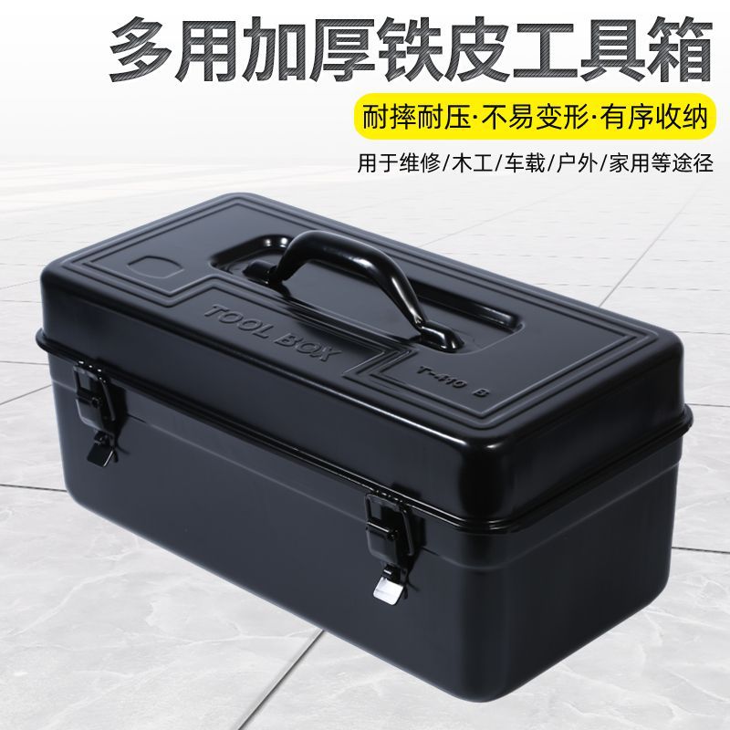 黒色の厚い鉄のツールボックスの手持ち式の家庭用収納ボックスの多機能の車載二重