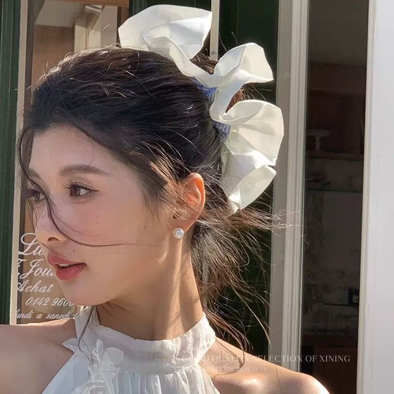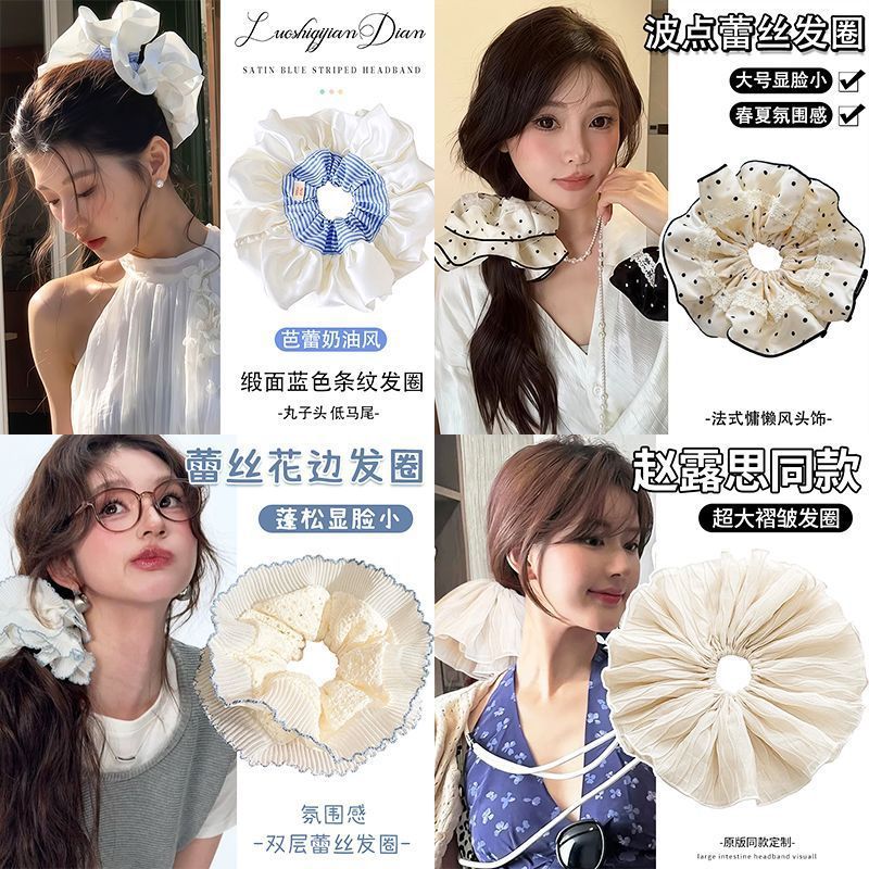 特大版クリームサテンレースバレエ風ブルーストライプ大腸シュシュ頭花甘いお姫様感絶美髪ひも