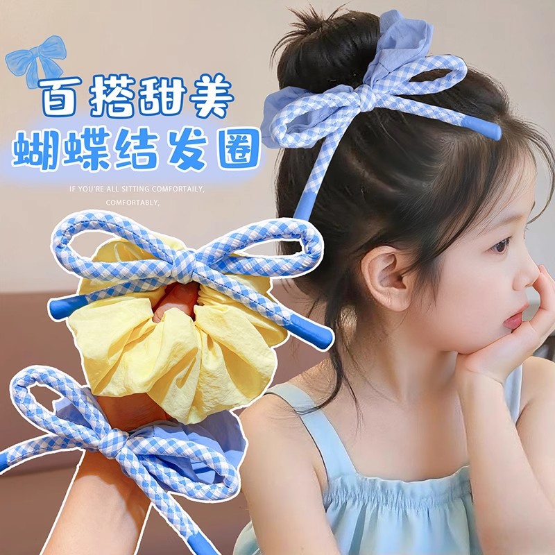 ブルーチェック柄結びリボン、女の子・子供用ヘアゴム、ふわふわ雲ヘアゴム、ヘアゴム、ボールヘアゴム