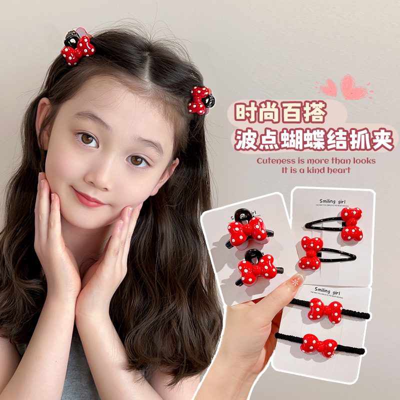 子供の可愛い赤い点の髪飾りの女の子の前髪の額が壊れています。
