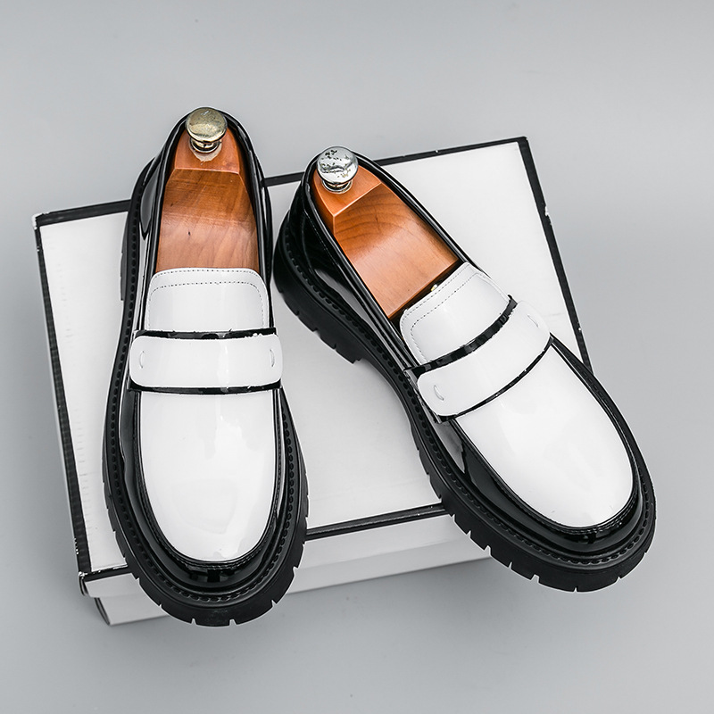 クロスボーダーカジュアルレザーシューズブラックパテントレザー英国風小さな革靴新しいスリッポンラウンドトゥローファー厚底靴