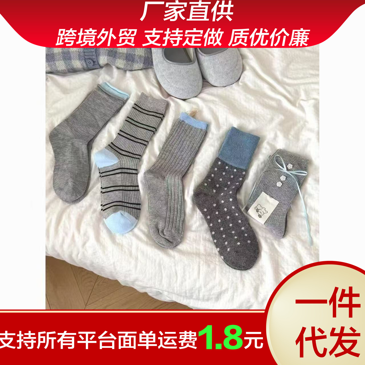 秋冬の女性の靴下の灰色の青い系のinsの韓国版は簡単に色を合わせて縁の丸い点を巻いてやせていることが現れます。