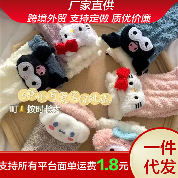オリジナルのサンリオの珊瑚の絨毯の靴下の女性の秋冬の白い中筒の靴下の保温の漫画の床の靴下は月子の靴下を厚くします。