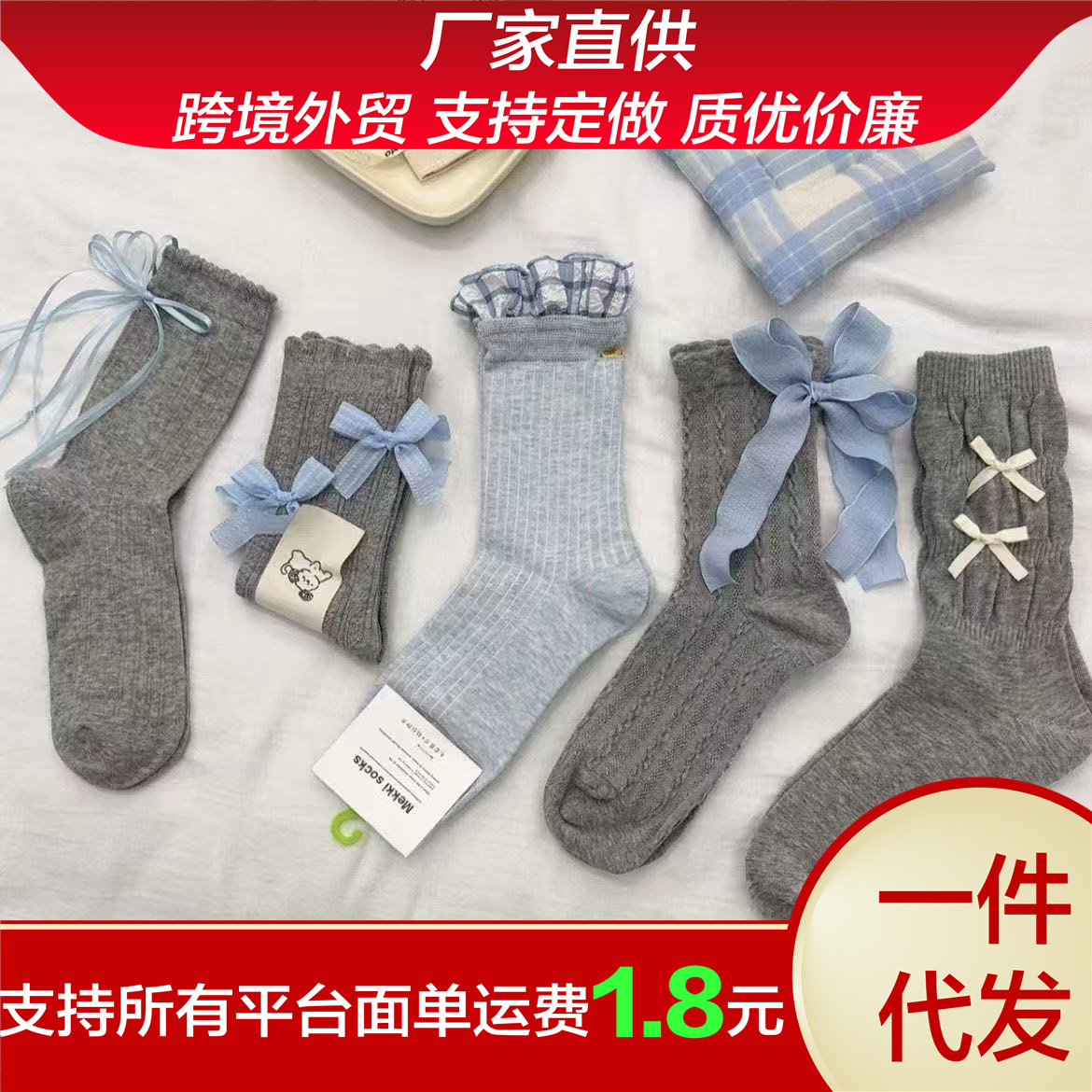 春夏韓系高颜値スタッキングソックス少女レース日系百合可格子灰青蝶結び靴下