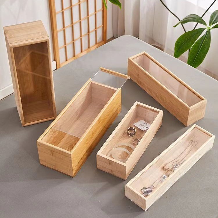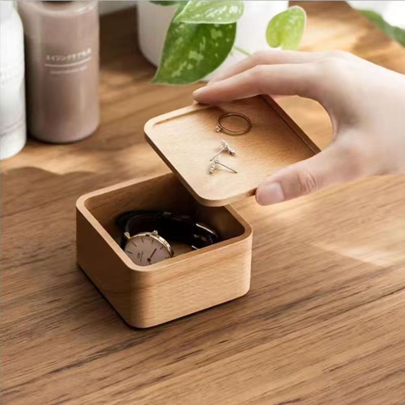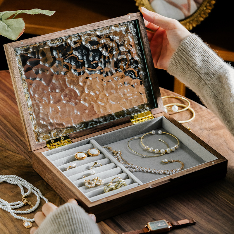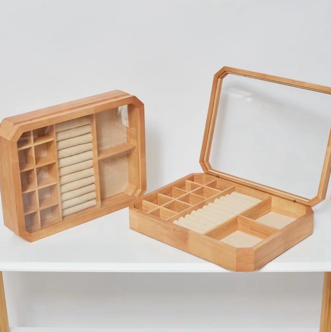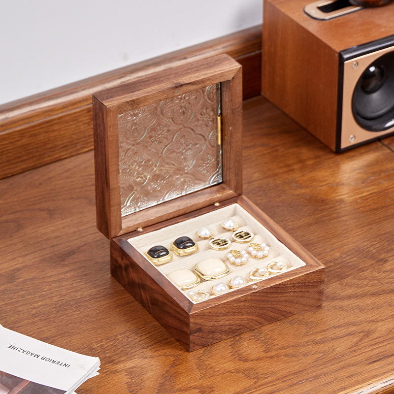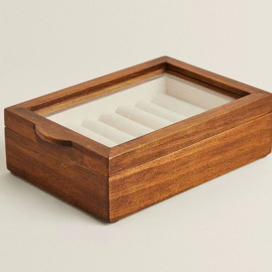 実木純指輪イヤリング収納ケースシンプル透明ガラス蓋アクセサリーケース綿麻裏地アクセサリーケース卸売り