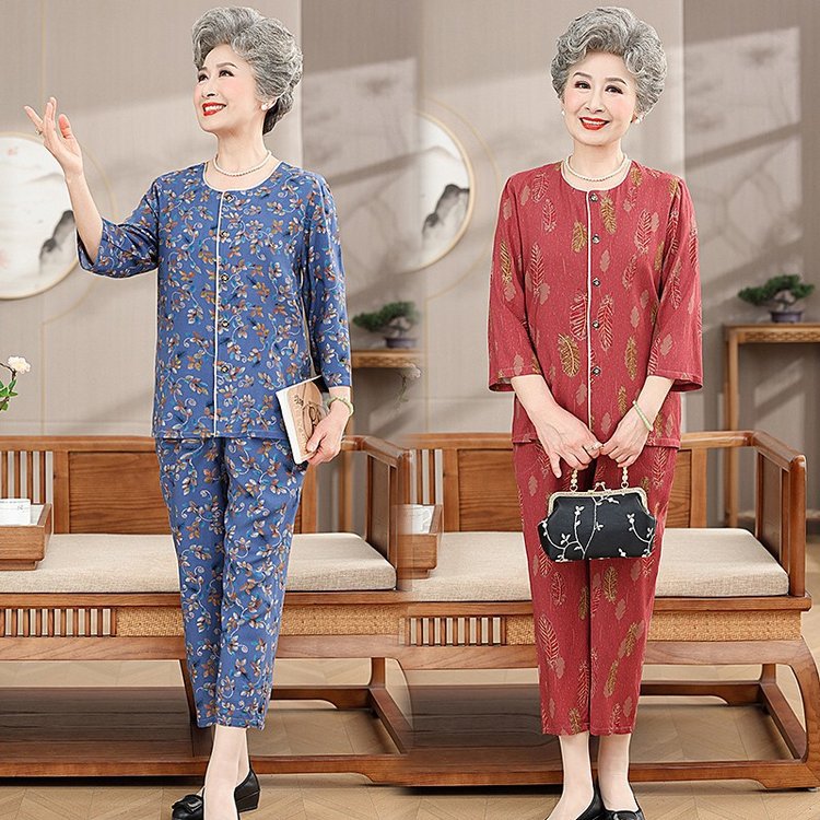 中高年の春秋服の女性のおばあさんは服の老人の綿の絹織物のスーツの60歳の70お母さんの夏の奥さんの2つのセットを詰めます。