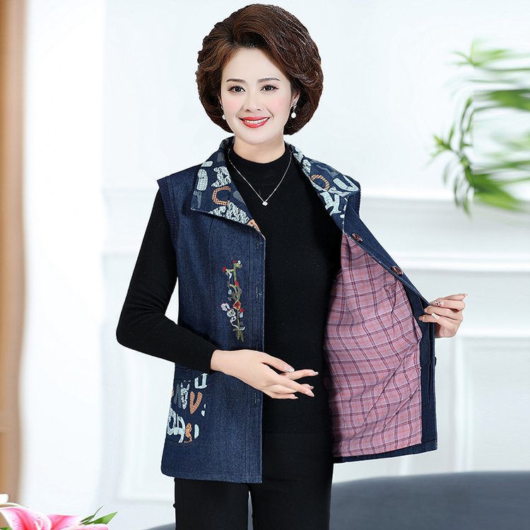 中高年の馬甲の女性の春秋の厚いタイプの綿のデニムの上着のお母さんの袖なしの肩のベストはおばあさんのベストを挟んで外に着ます。