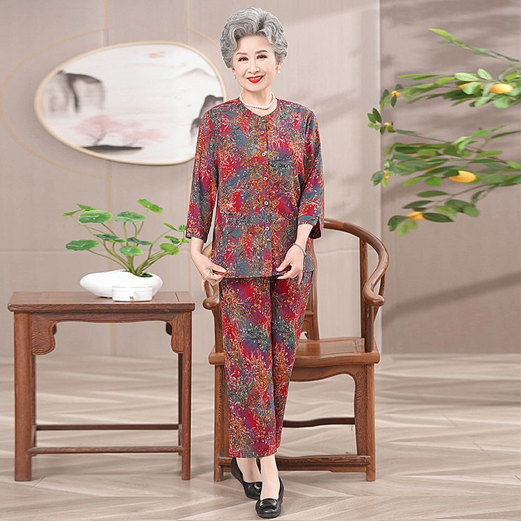 高齢者の婦人服、おばあちゃんのサマースーツ、七分袖の母親のサマードレス、コットンシルクのツーピーススーツ、高齢者のカーディガン、妻の服
