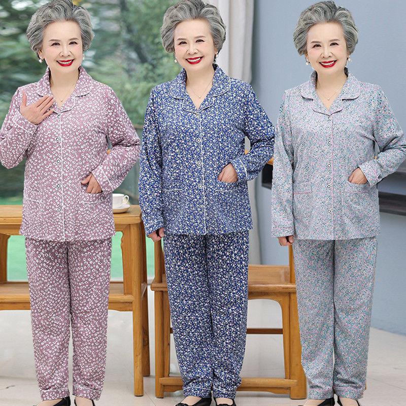 中高年パジャマ女性春と秋の長袖純綿のカーディガンのお母さんの家の服のおばあさんの春の2つのセット