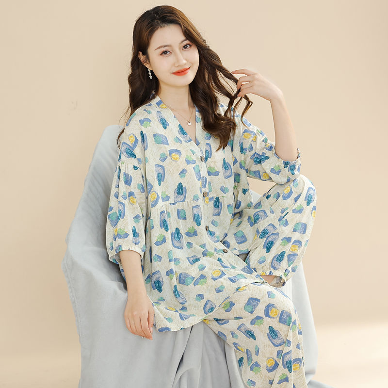 2023年新品春夏パジャマレディースコットン七分袖足つきロングパンツカジュアルアウター可ホームウェアスーツ