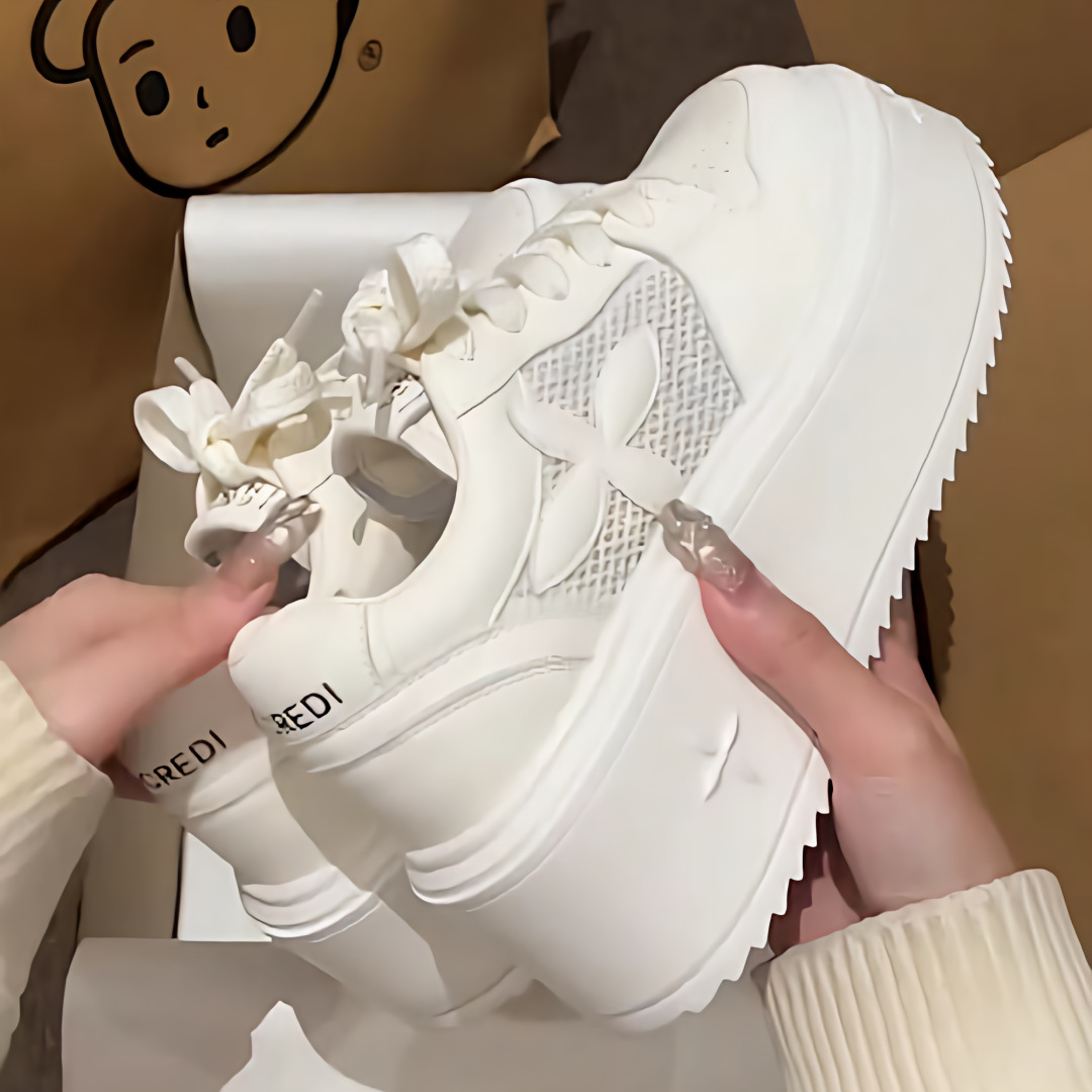 女性靴夏の新型レトロなネットの通気性の小さい白い靴2025厚い底の百合ネットの靴の学生の板の靴の女性