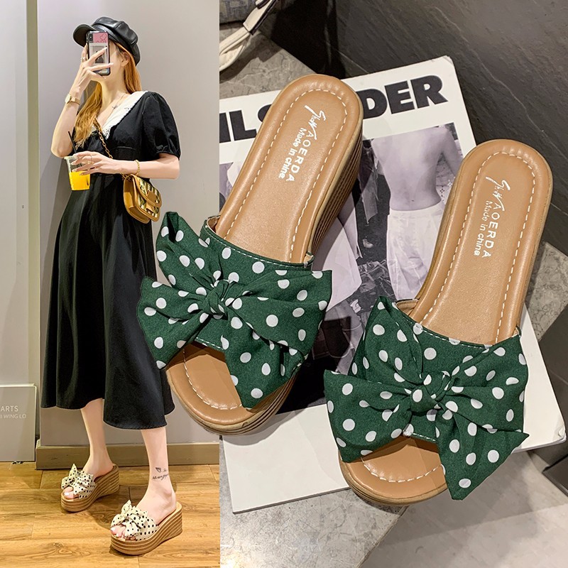 新しいスリッパの女性の夏の韓国版の外は蝶結びの花のビーチの靴のサンダルの女性のネットの赤いinsのフラットスリッパを着ます。