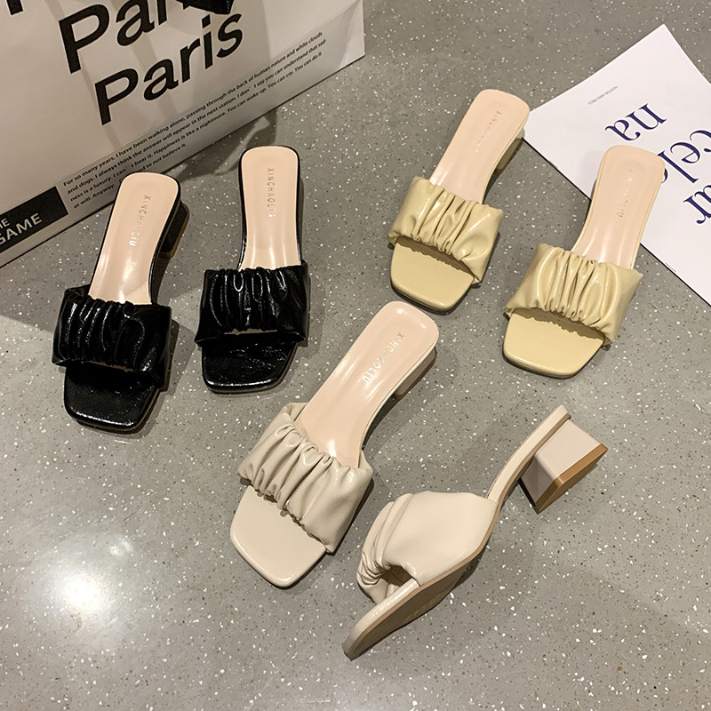 ネットの赤いしわのスリッパ2023新型の女性の夏の外は香港の風のファッションの太さと1字の海辺の砂浜のスリッパのメーカーを着ます。