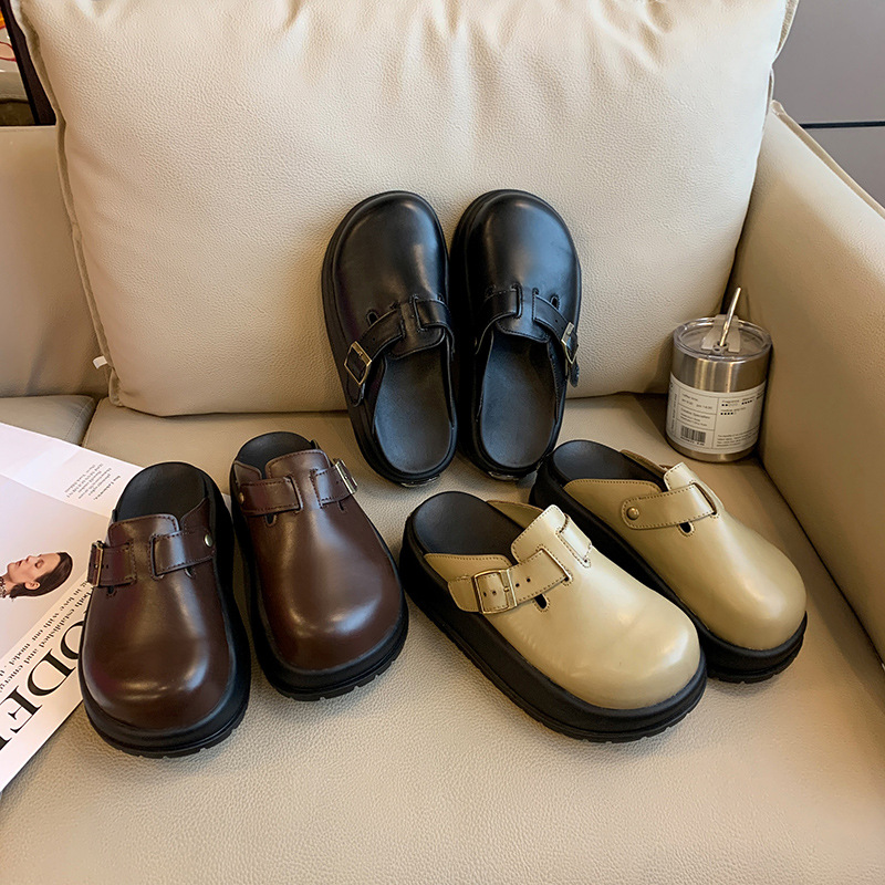 厚底つま先ハーフスリッポンネットレッドレトロレザースリッポンローファーレディースミュールスリッパ女性アウターウェア高級感
