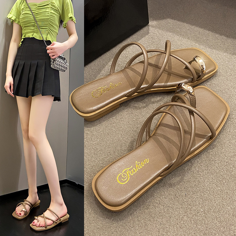 ファッショナブルでシンプルな薄いストラップスリッパ女性のための 2025 春夏の新しいスクエアトゥメタルバックル韓国スタイルのスリッポントゥフラットサンダル