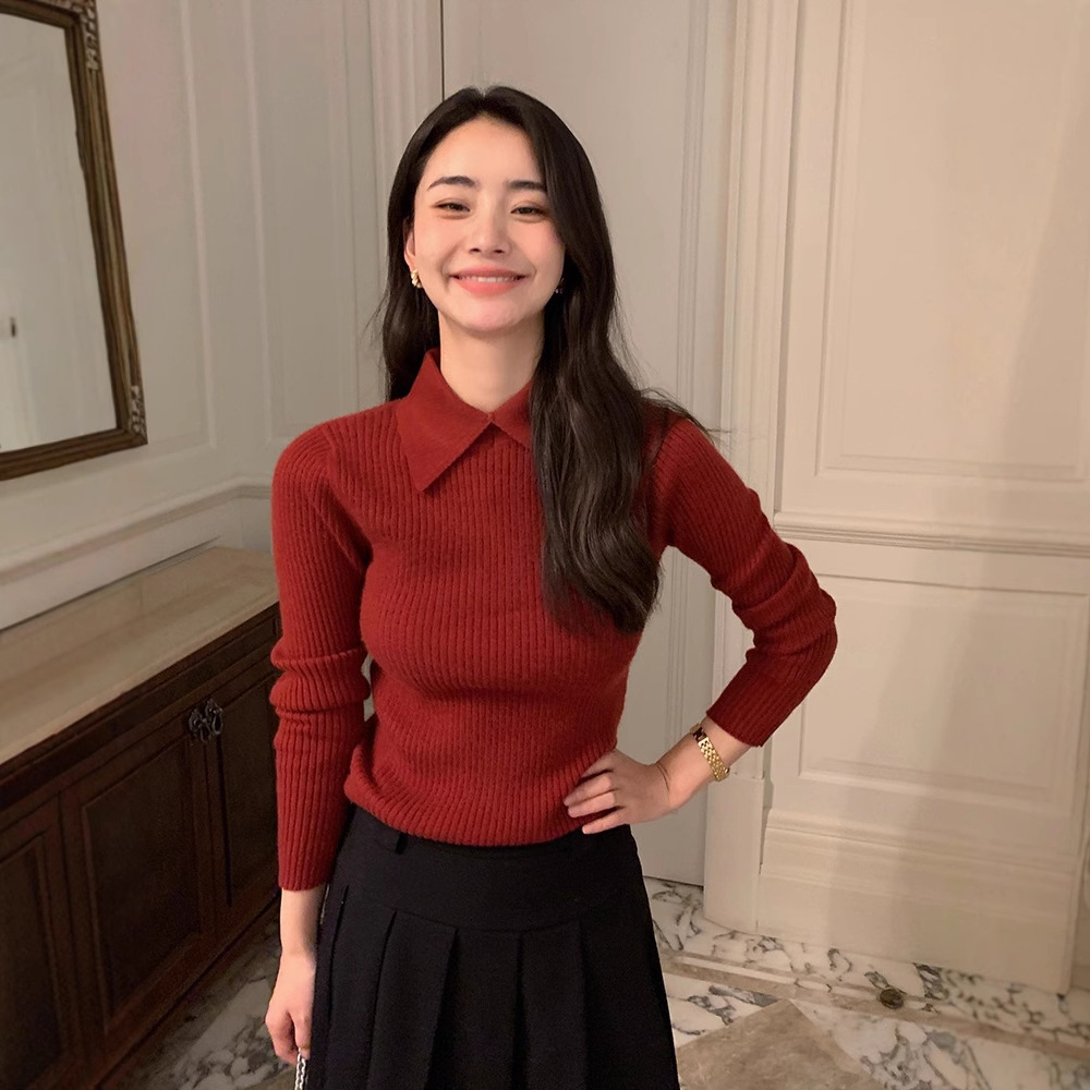 POLO襟のカシミヤの女性の秋冬の新型の個性の襟のプルオーバーの純色の修身の上着のウールの底のシャツ