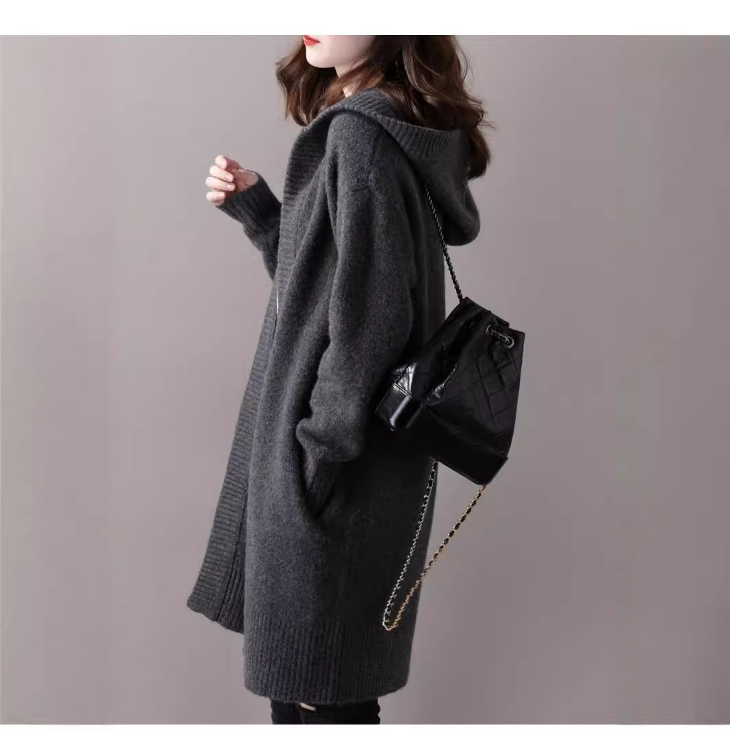 怠惰な風が厚くなって帽子の中の長いウールのカーディガンのコートの女性が暖かくてゆったりしている長袖のカシミヤのニットの外で合わせます。