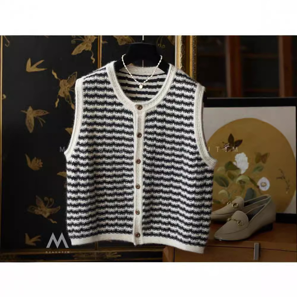 レトロなノースリーブストライプのウールベストセーター女性2024年秋冬新作ショートカシミヤニットカーディガン