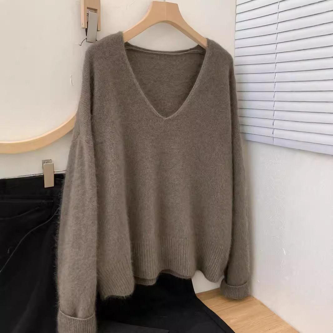 韓国系の怠惰なvネックのセーターのウールの女性はゆったりとしていて、痩せています。