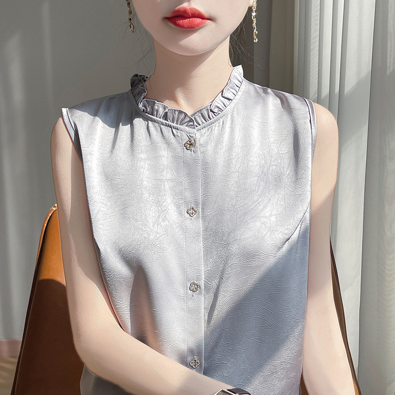 フレンチサテン2025年春夏新作立襟木耳元シャツ袖なし純色シワゆるい上着カーディガン