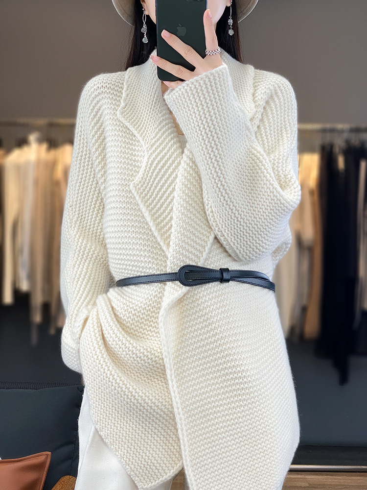 厚みのあるミドル丈のカシミヤカーディガン、女性用スーツの襟付きニットセータージャケット、ルーズウールセータートップ