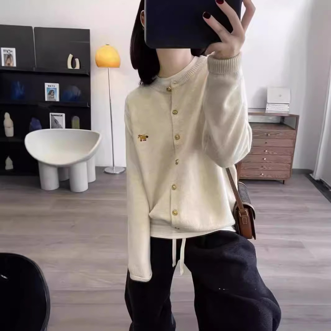 精巧な刺繍のポニーカーディガンの丸首の金属ボタンのカジュアルな柔らかいモチモチのカシミヤのニットのカーディガンの新型のセーターのコート