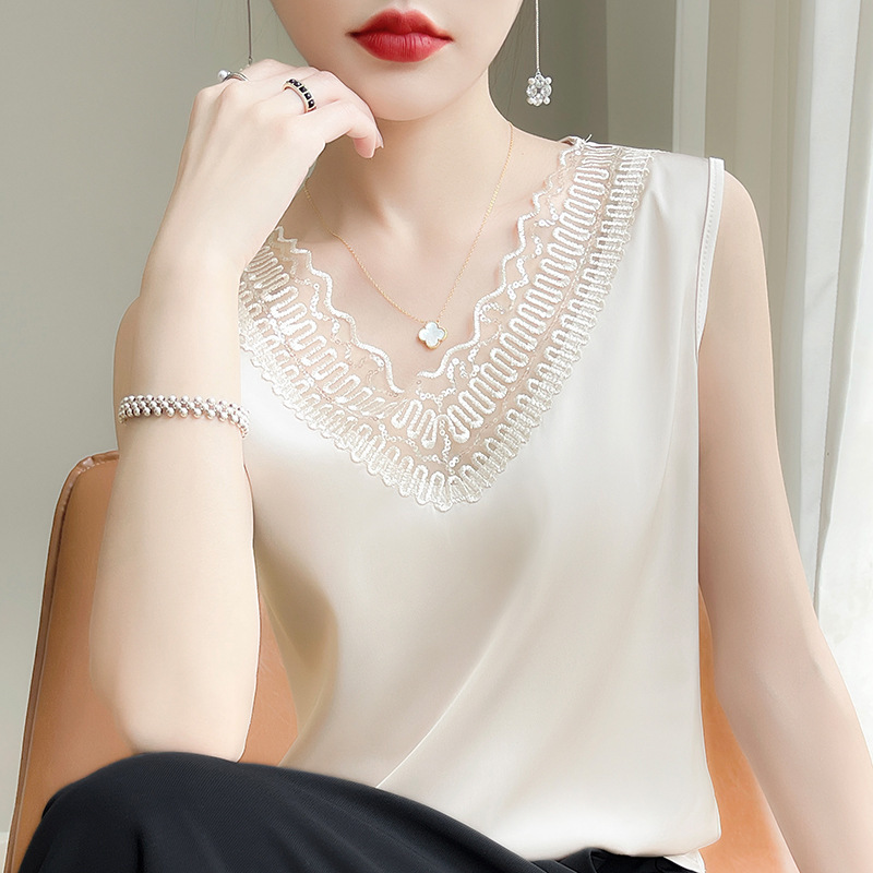 気質のサテンの2024夏の婦人服の新型vネックの袖なしの小さいベストのtシャツのネットの紗は上着のゆったりしているサスペンダーをつなぎ合わせます。