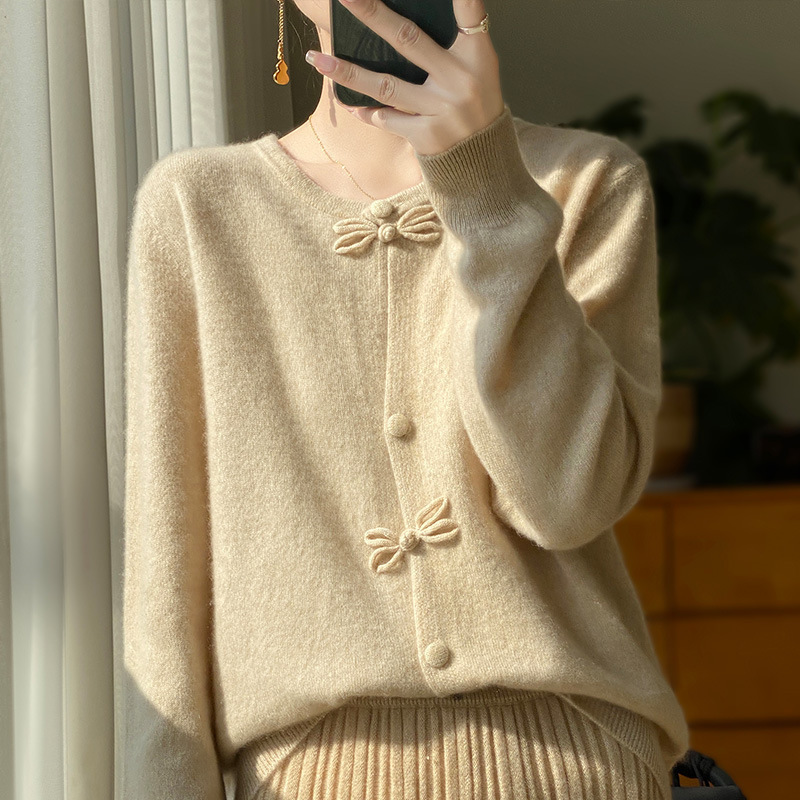 2024秋冬の新型中国式の美しい国風のウールのカーディガンのボタンは女性の丸首の小さい大衆のカシミヤのニットを設計します。