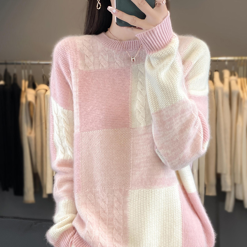 新しい秋冬のチェスのセーターの女性の丸首のセーターの色合わせのプルオーバーの厚いカシミヤのニットの底のシャツ