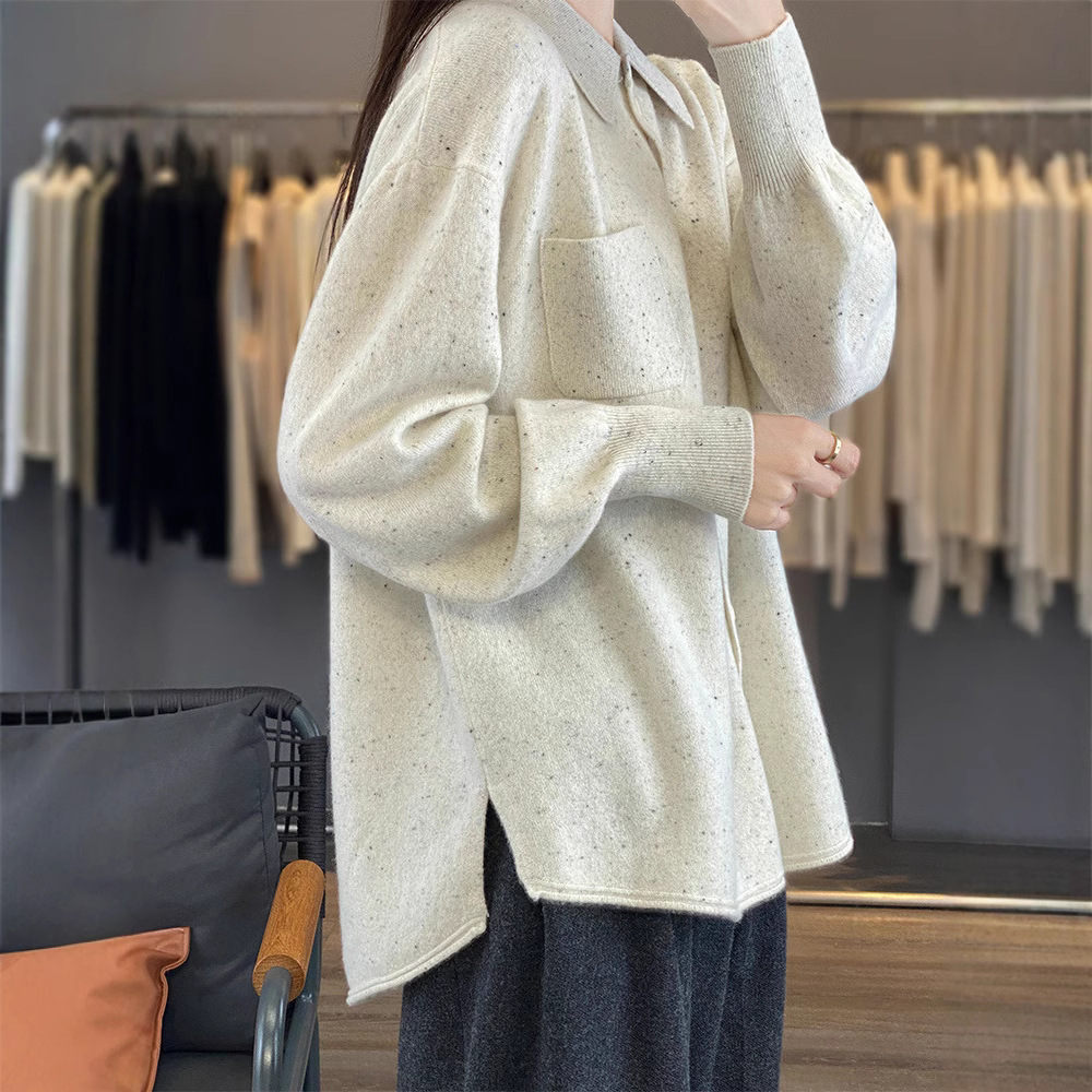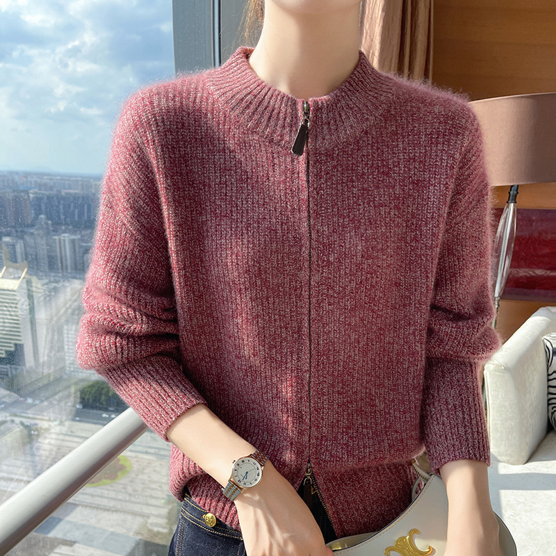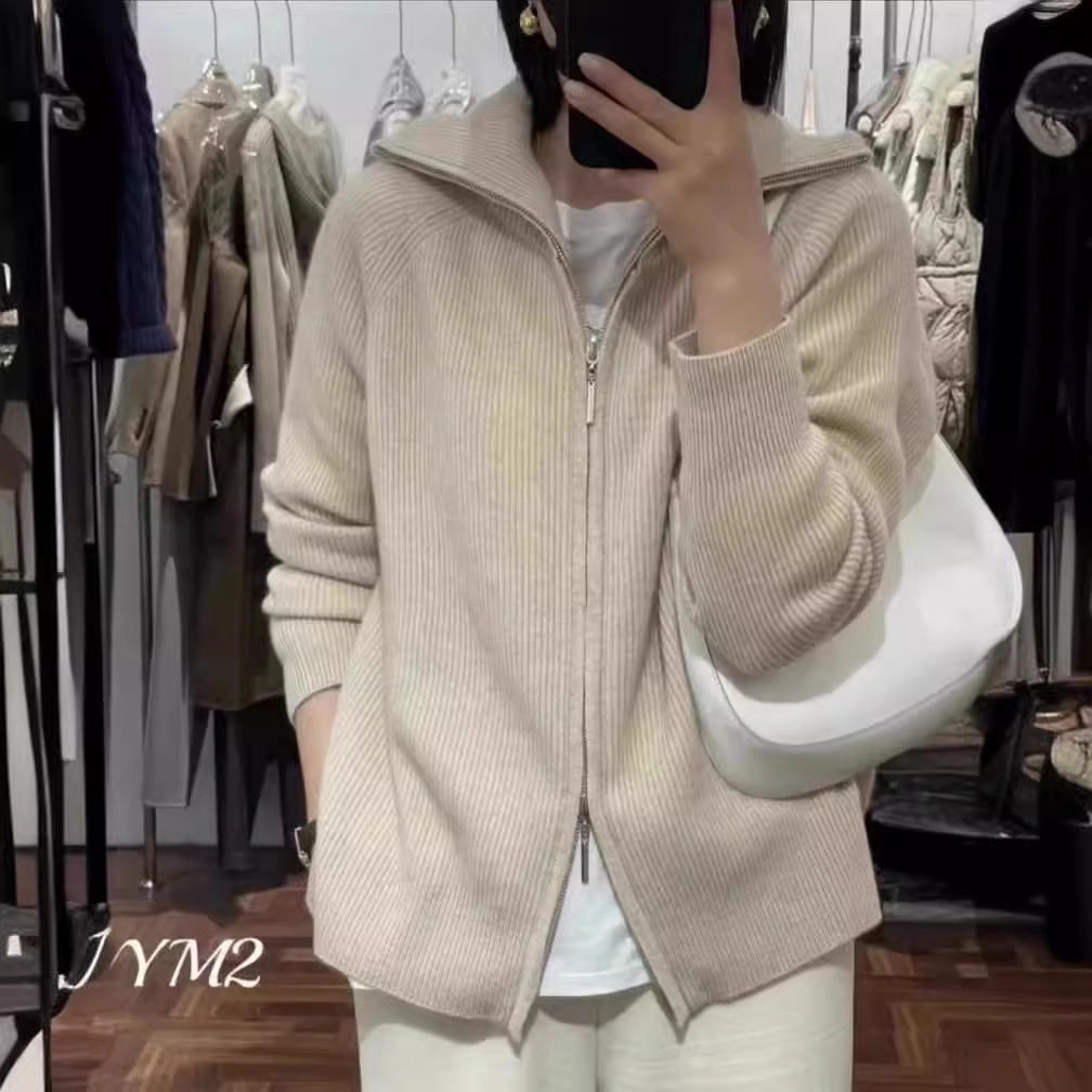 秋冬の新型100ウールPOLO襟ファスナーカーディガン女性の怠惰でゆったりしたファッションの襟付きニットセーターのコート