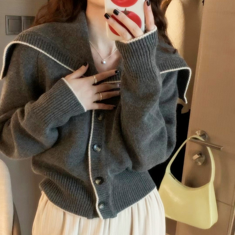 2024 新しい厚いウールのセーター女性のネイビーカラーセーターカーディガンボタンニットルーズボトムトップジャケット