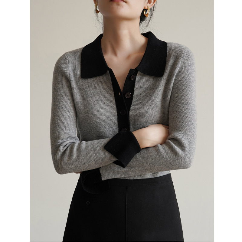 2024春夏精紡毛ウールの新型女性polo襟付き気質ニットカーディガンシャツカジュアルシャツ薄い
