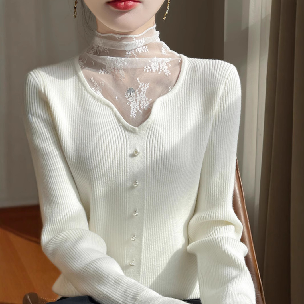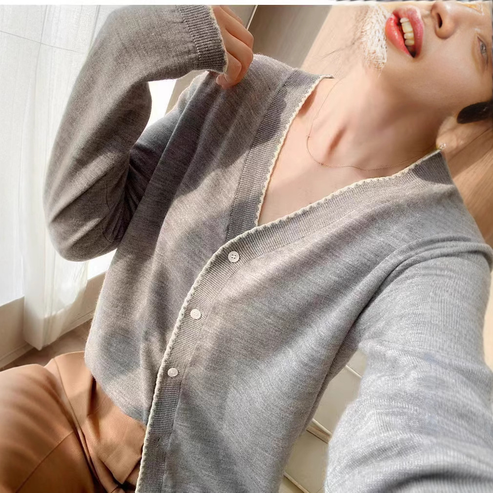 2025春秋精紡ウールカーディガン女性vネック波レースセーター