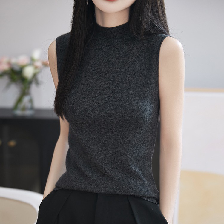2025春秋半高襟袖なし精織100ウールニットキャミソール女性スーツに袖セーターをかける