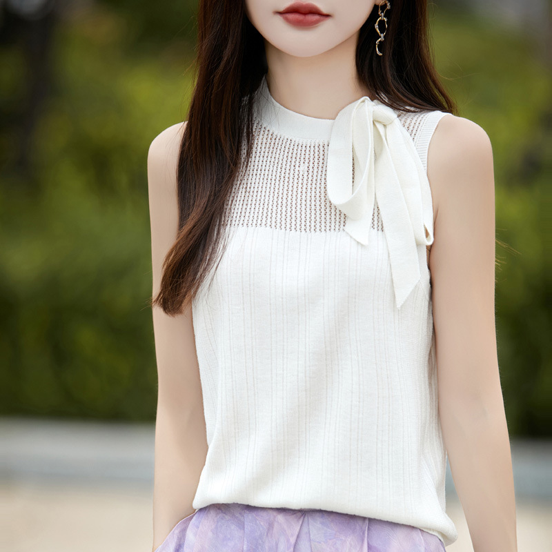 2025春夏欧根紗レースの中にウールの女性の立襟の袖なしの木の耳元のシャツのニットの底のシャツのベストを掛けます。