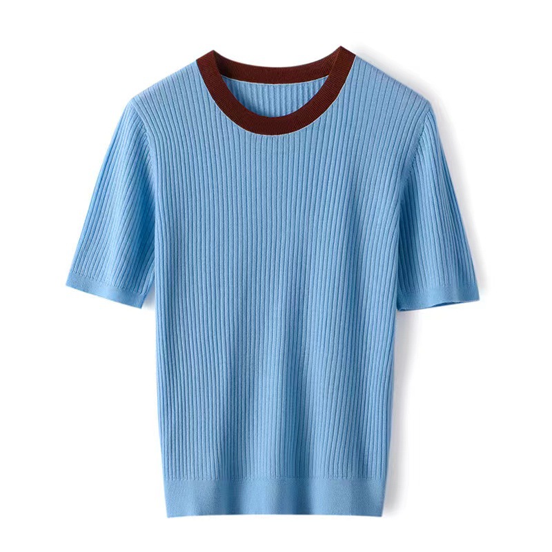 2024夏の新型精紡ウールのセーターのピットは色の半袖の丸首の薄い金のゆったりしている半袖のメリヤスの上着にぶつかります。