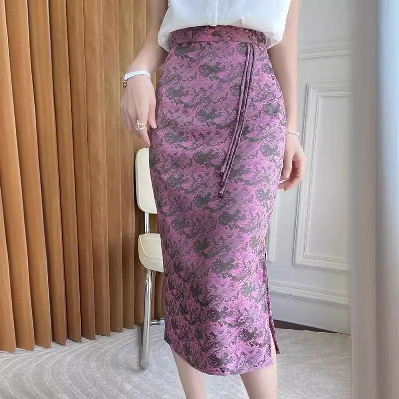 2024夏の新しい酢酸サテンのスカートの女性のチャイナドレスの中の長い一歩のスカートの中国風のヒップスカート