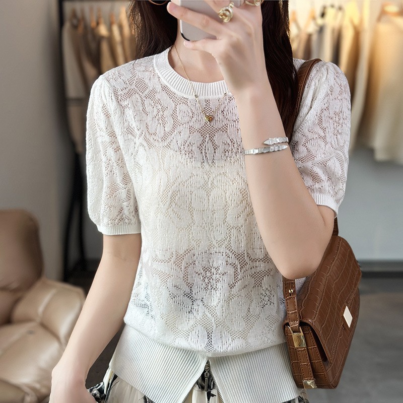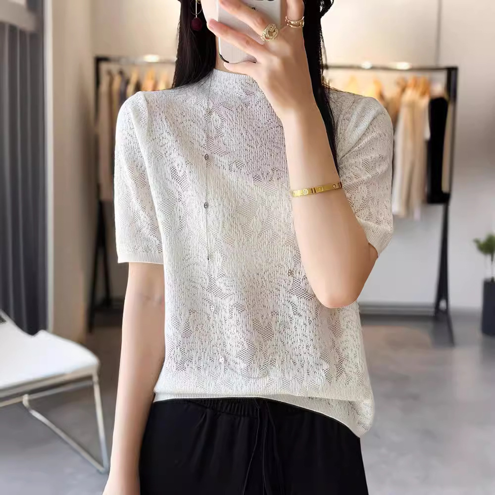 2024種類の夏の女性ウール透かし編み半袖丸首精紡毛ウール半袖通気快適超薄tシャツ