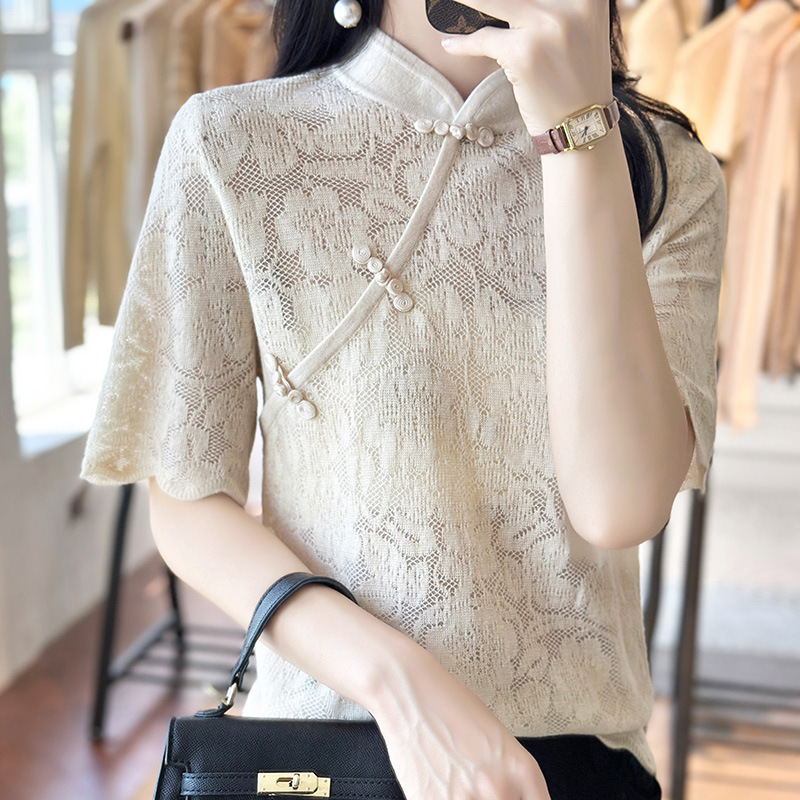 透かし彫りの精紡のウールのニットのカーディガンの女性の夏の新しい中国風の盤は上着の薄い通気性の短いタイプの日焼け止めを掛けます。